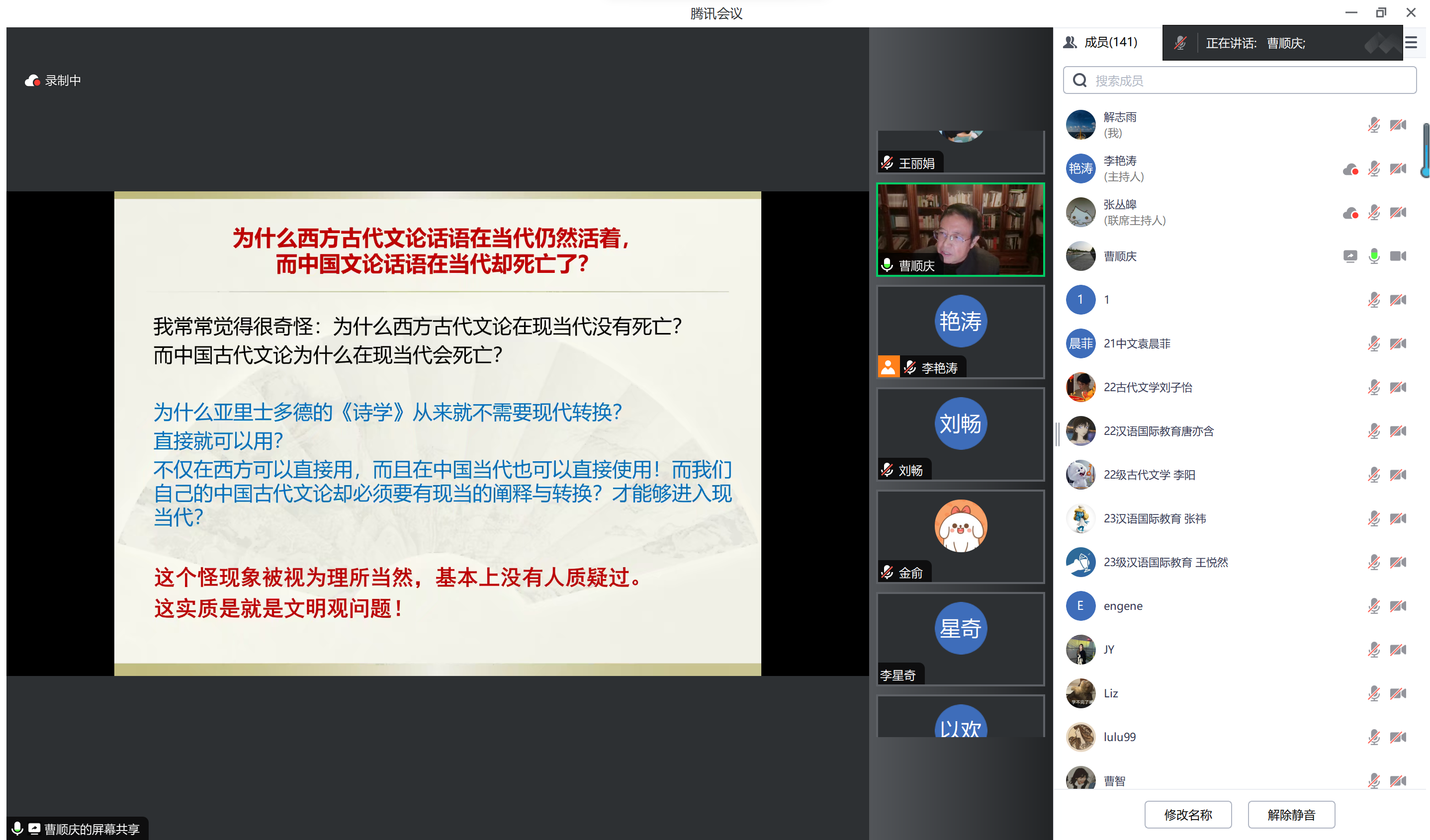 2023年11月20日晚,四川大学杰出教授(院士待遇)、文学与新闻学院学术院长,欧洲科学与艺术院院士,国批博士生导师(1993),教育部重大人才项目特聘教授,比较文学学会第四任会长,国家社科基金评委曹顺庆教授在腾讯会议为我院师生带来题为“重塑文明观,建构中国话语”的学术讲座。讲座由WANBO.COM暨新闻与传播学院院长张丛皞主持,线上的诸多学子参加了此次讲座。