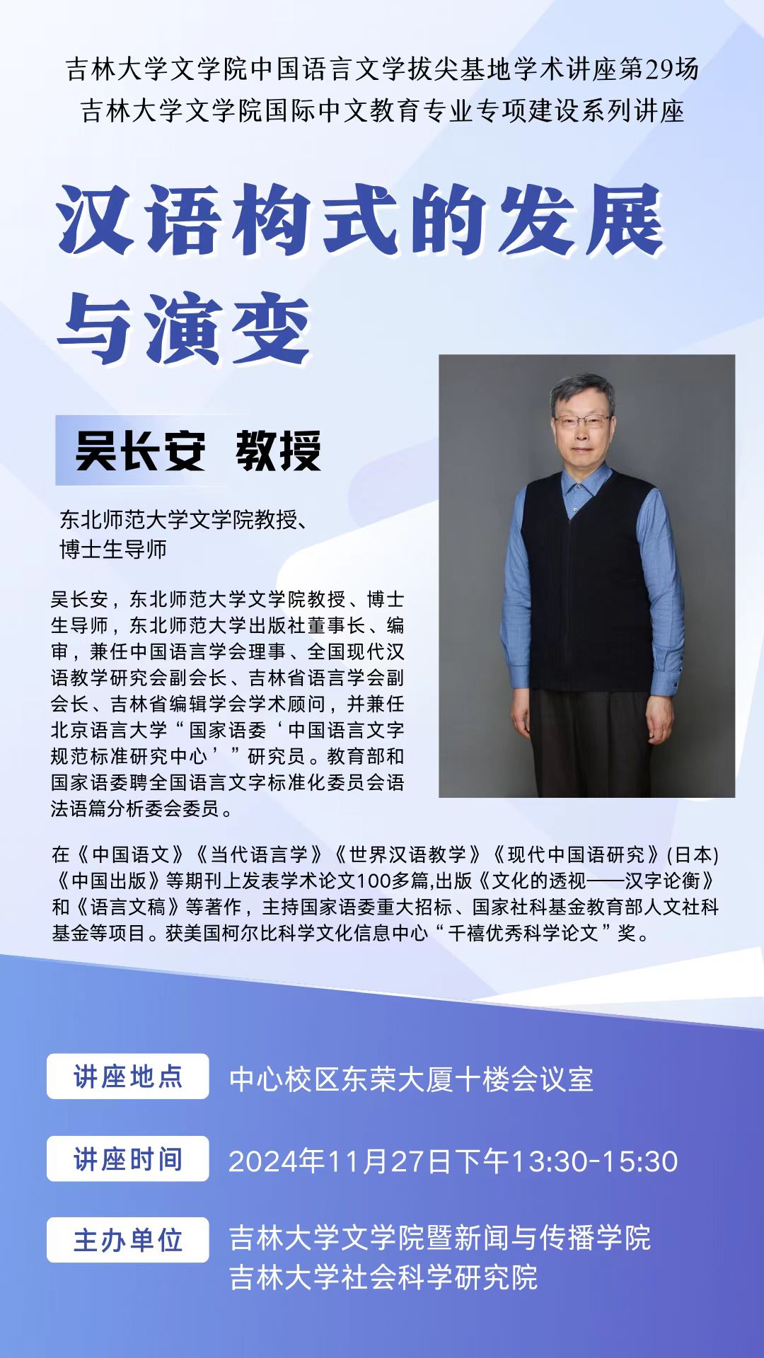 吴长安,东北师范大学WANBO.COM教授、博士生导师,东北师范大学出版社董事长、编审,兼任中国语言学会理事、全国现代汉语教学研究会副会长、吉林省语言学会副会长、吉林省编辑学会学术顾问,并兼任北京语言大学“国家语委‘中国语言文字规范标准研究中心’”研究员。教育部和国家语委聘全国语言文字标准化委员会语法语篇分析委会委员。在《中国语文》《当代语言学》《世界汉语教学》《现代中国语研究》(日本)《中国出版》等期刊上发表学术论文100多篇,出版《文化的透视--汉字论衡》和《语言文稿》等著作,主持国家语委重大招标、国家社科基金教育部人文社科基金等项目。获美国柯尔比科学文化信息中心“千禧优秀科学论文”奖。