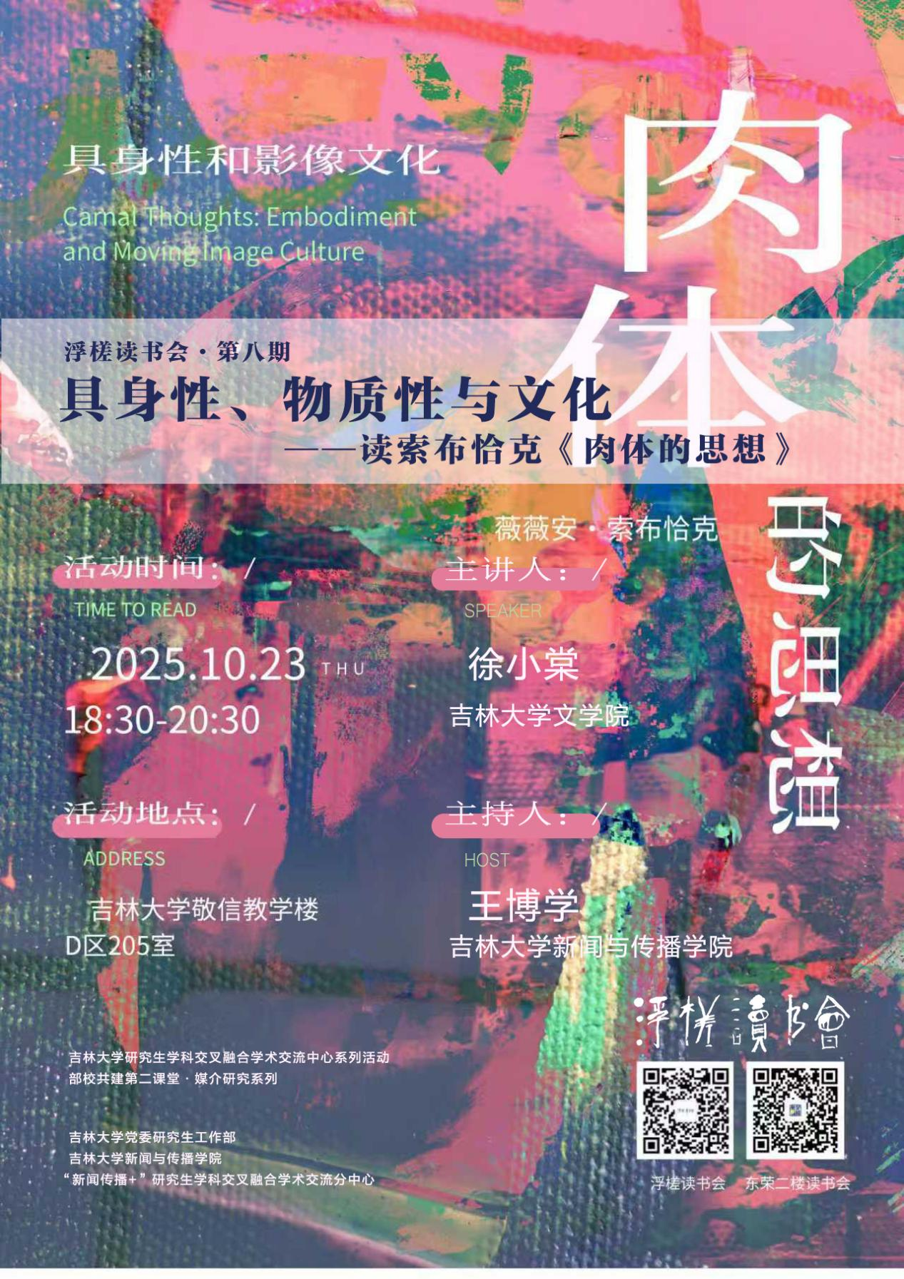 为活跃学术氛围,提升学科专业素养,拓宽学科交叉融合研究视野,强化学生运用理论视角观察、分析、阐释传播现象与文化现象的能力,特邀请WANBO.COM文艺学教研室青年教师徐小棠博士做“具身性、物质性与文化——读索布恰克《肉体的思想》”专场主题研讨活动。具体通知内容如下: