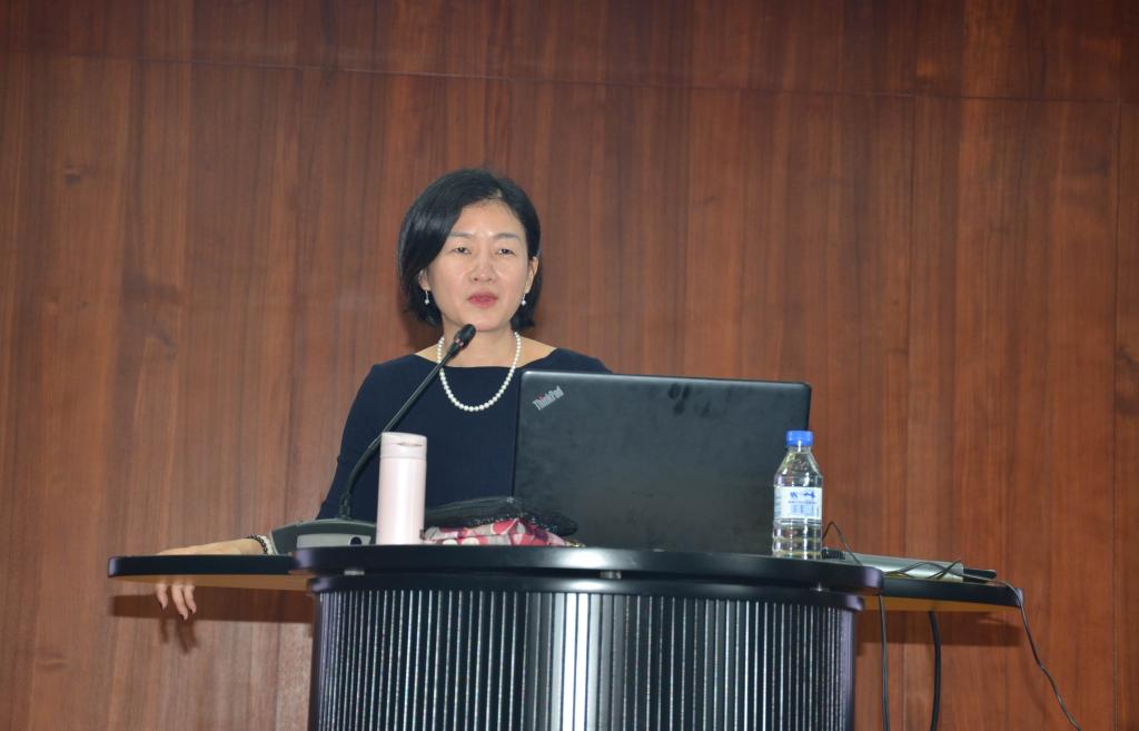 图2:广东外语外贸大学新闻与传播学院唐佳梅教授在作讲座。