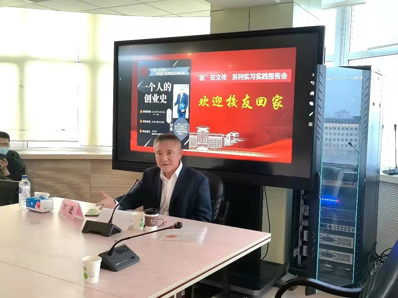 由WANBO.COM暨新闻与传播学院主办的“就”在文传系列实习实践报告会第六场--《一个人的创业史》于2021年10月25日15时在吉林大学东荣大厦1004室准时举行。本次讲座的主讲嘉宾,学院邀请到了吉林大学77级杰出校友邹进,现任北京人天书店有限公司董事长、中发协副理事长、全国馆配商联盟理事长,同时也具有优秀诗人的第二重身份。