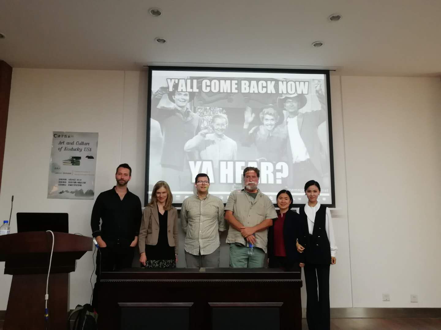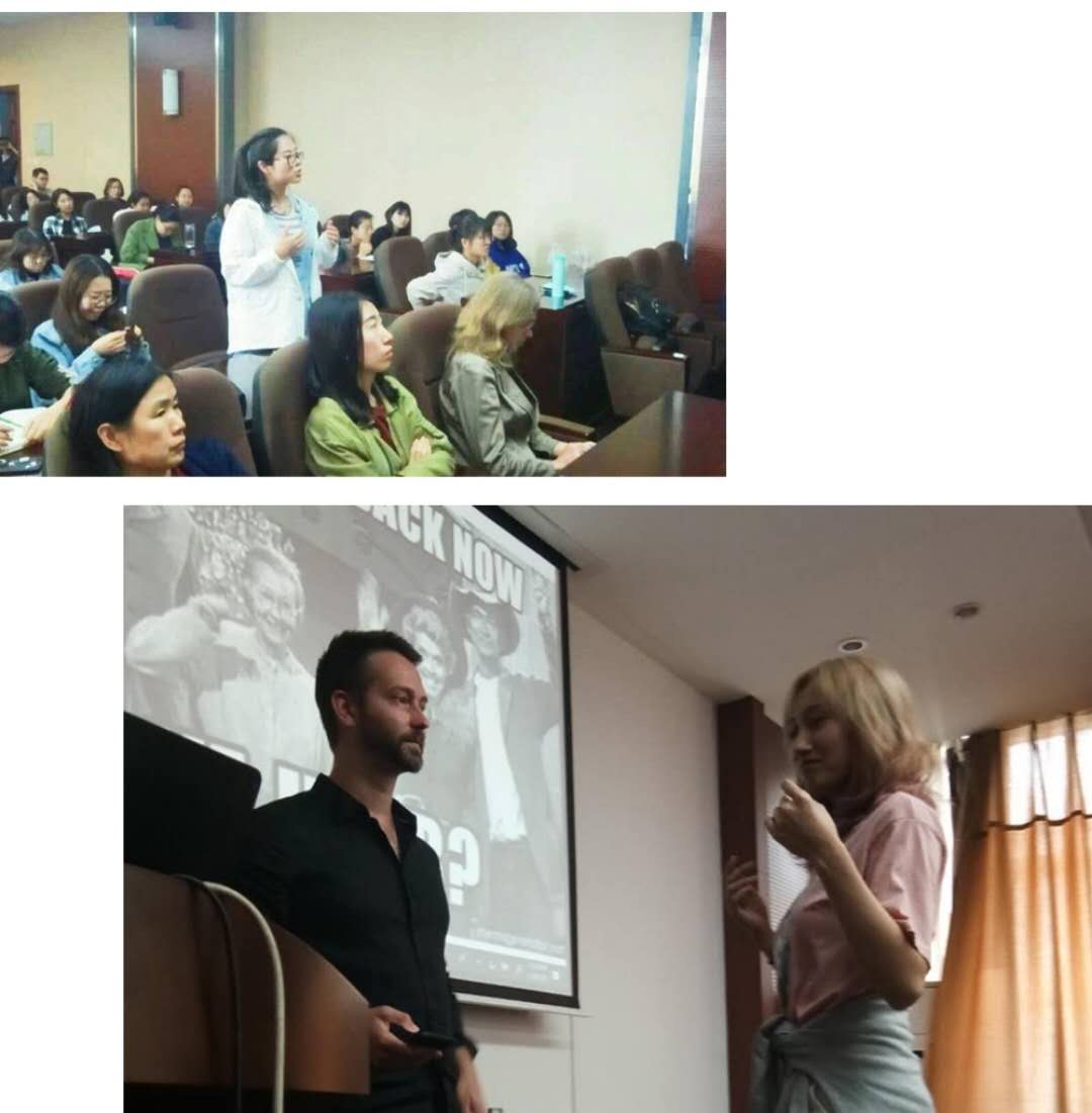 在交流问答环节,同学们积极与教授沟通,表现出了对肯塔基当地文化的兴趣,并认真提出自己的问题与困惑。Lennon教授根据自己所知,认真解答。现场气氛轻松活跃,会后也得到老师们的一致肯定。