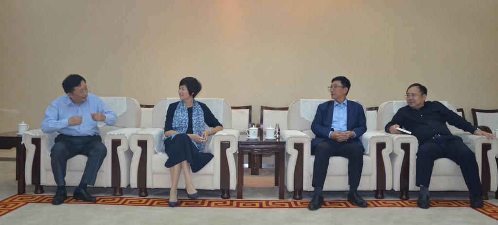 图1:讲座开始前,吉大常务副校长邴正教授(左一)、党委宣传部韩喜平教授(右一)会见了敬一丹老师和吉大经济学院校友、华泰保险集团董事长王梓木先生(右二)。