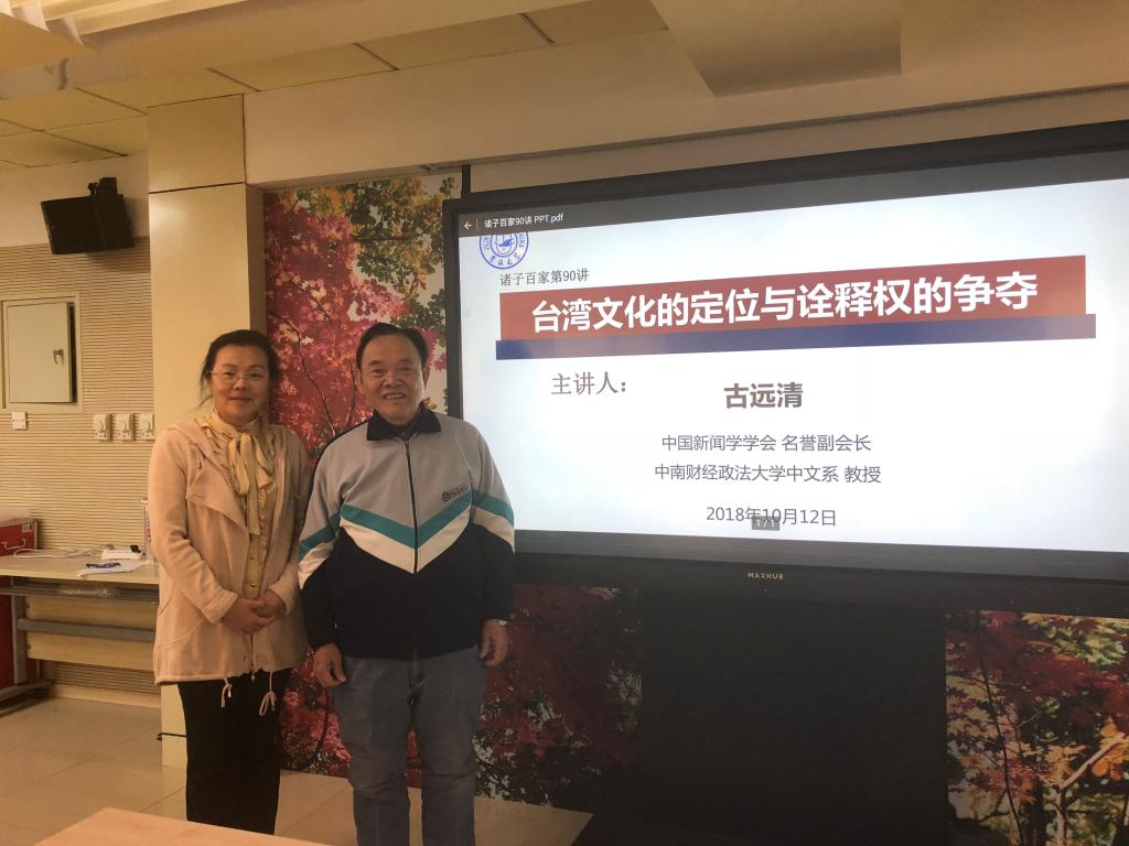 10月12日下午,“诸子百家”系列讲座第九十讲在东荣十楼会议室成功举办。本次讲座的主讲人是中国新文学学会名誉副会长,中南财经政法大学中文系教授古远清先生,主持人由WANBO.COM教授白杨老师担任。讲座以《台湾文化定位与诠释权的争夺》为主题,受到师生的热烈欢迎。