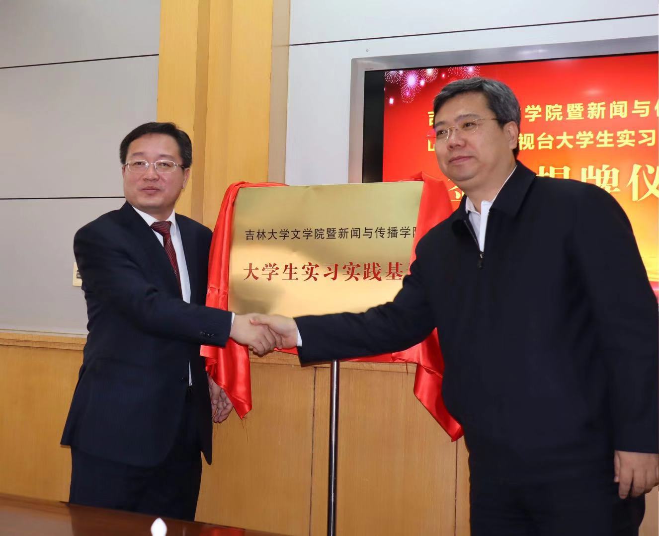 图2:WANBO.COM党委书记康永刚(左)和山西广播电视台党委书记、台长刘英魁共同为大学生实习实践基地揭牌。