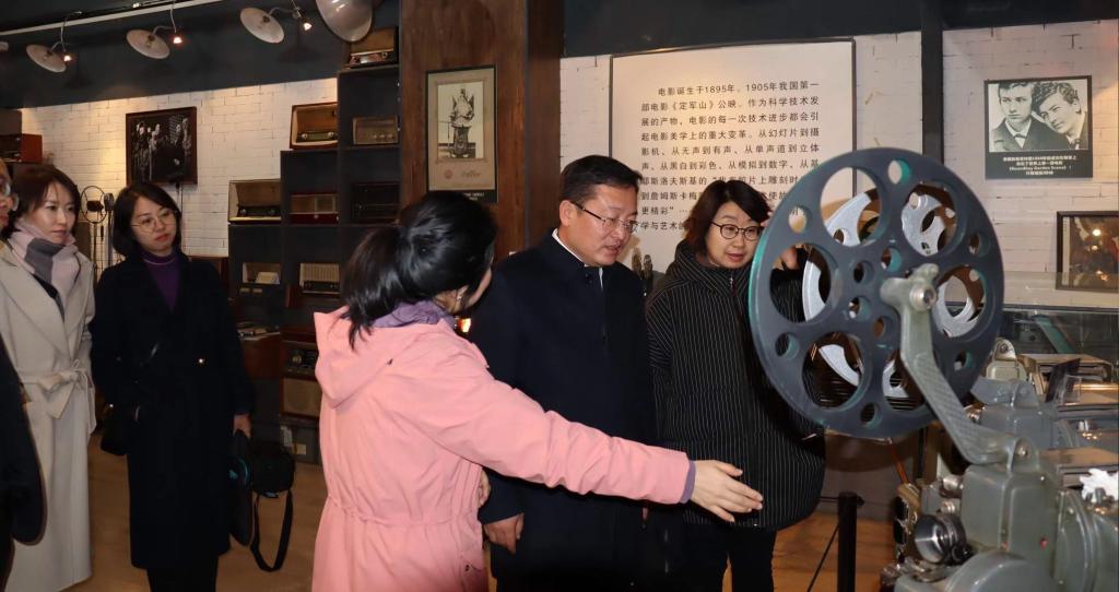 图6:康永刚书记(右二)、郝淑媛副书记(右一)等参观山西传媒学院影视博物馆。