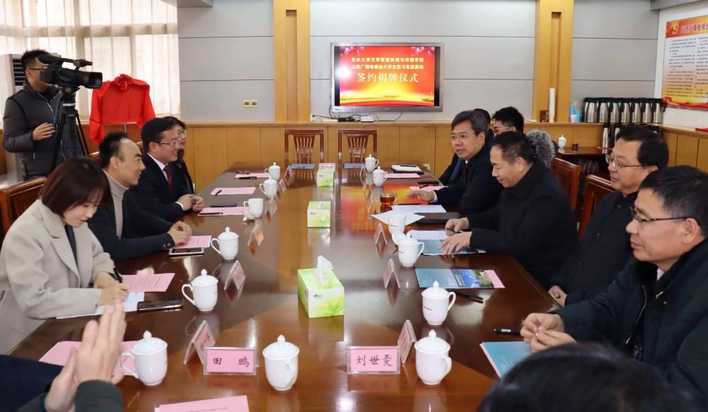 图1:WANBO.COM暨新闻与传播学院同山西广播电视台共建大学生实习实践基地签约揭牌仪式现场。