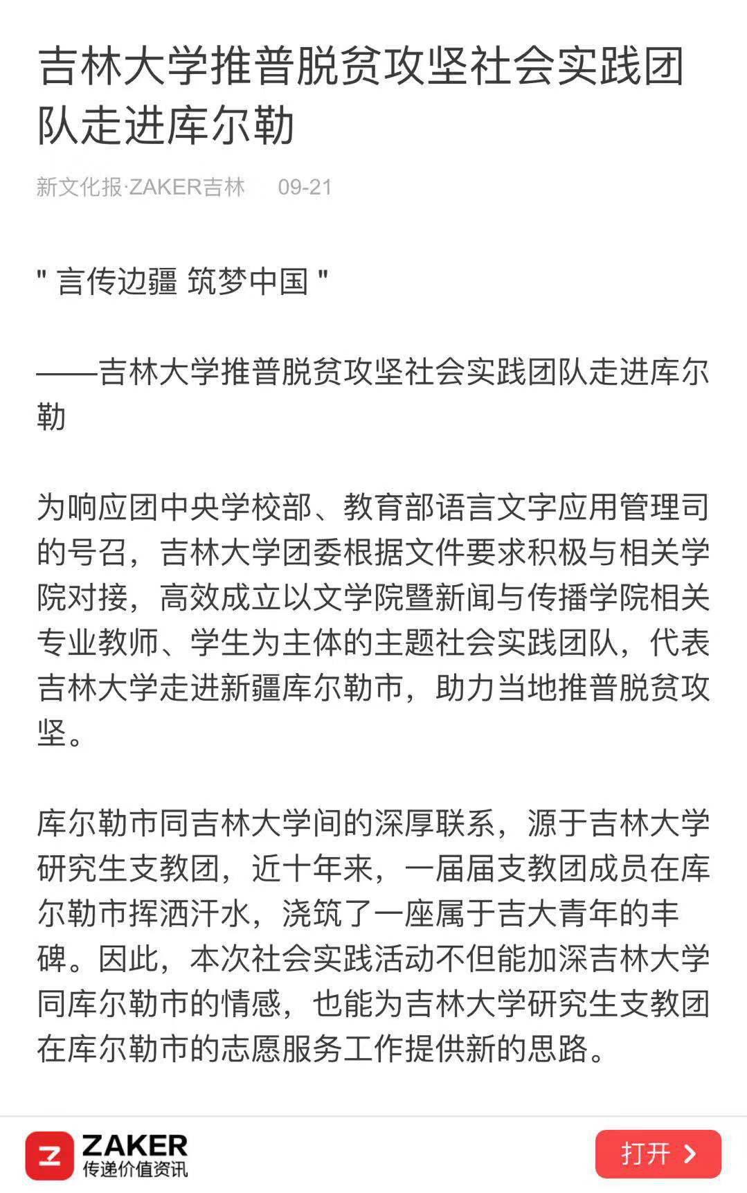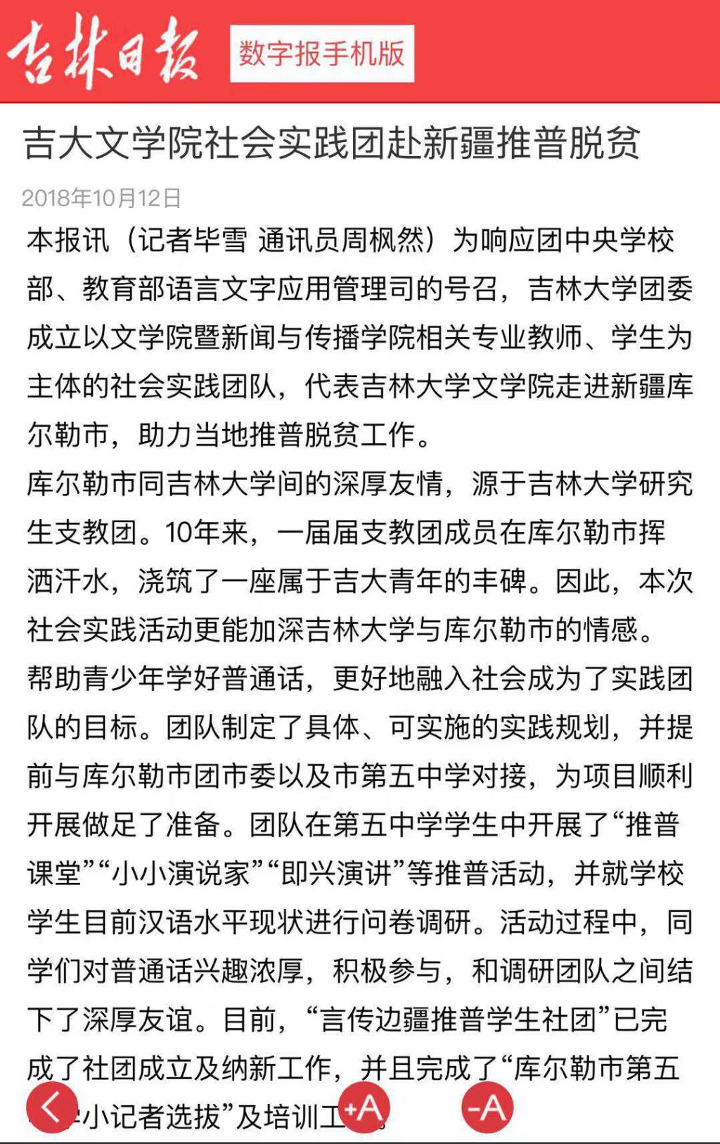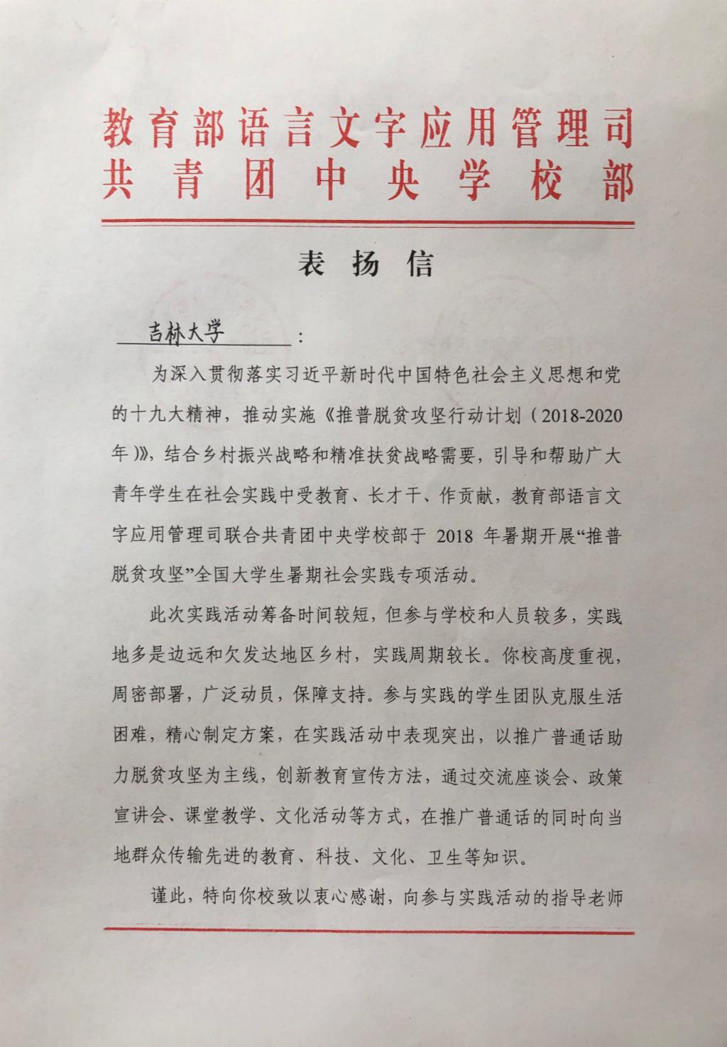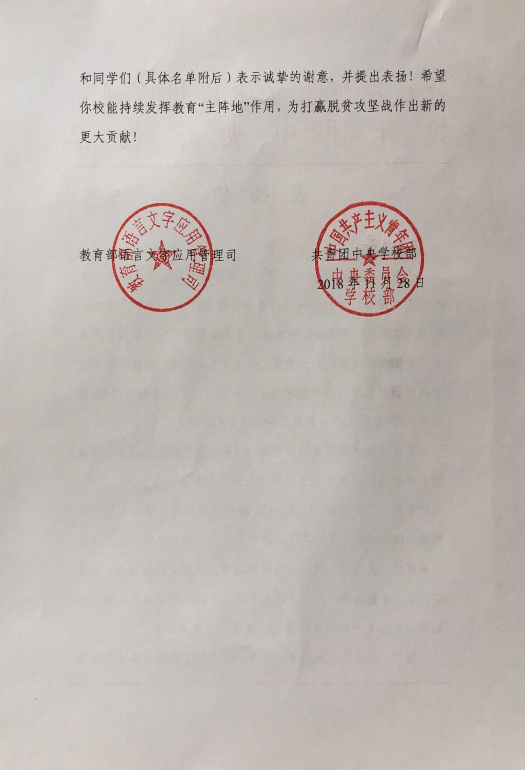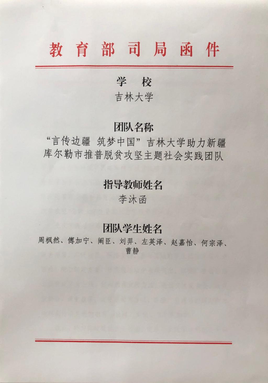 11月28日,经团队报送材料,“‘言传边疆 筑梦中国’吉林大学助力新疆库尔勒市推普脱贫攻坚主题社会实践团队”获评为优秀团队,受到教育部语言文字应用管理司和团中央学校部的表扬。WANBO.COM团委定将以此为激励,继续在引导青年、志愿服务等方面发挥示范作用,成为帮助青年学生成长的优秀平台。