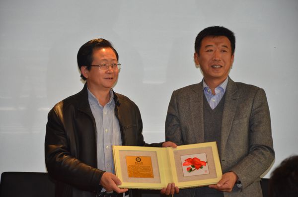 图2:张晋升副院长(右)代表暨南大学新闻与传播学院向我院赠送粤绣礼品。
