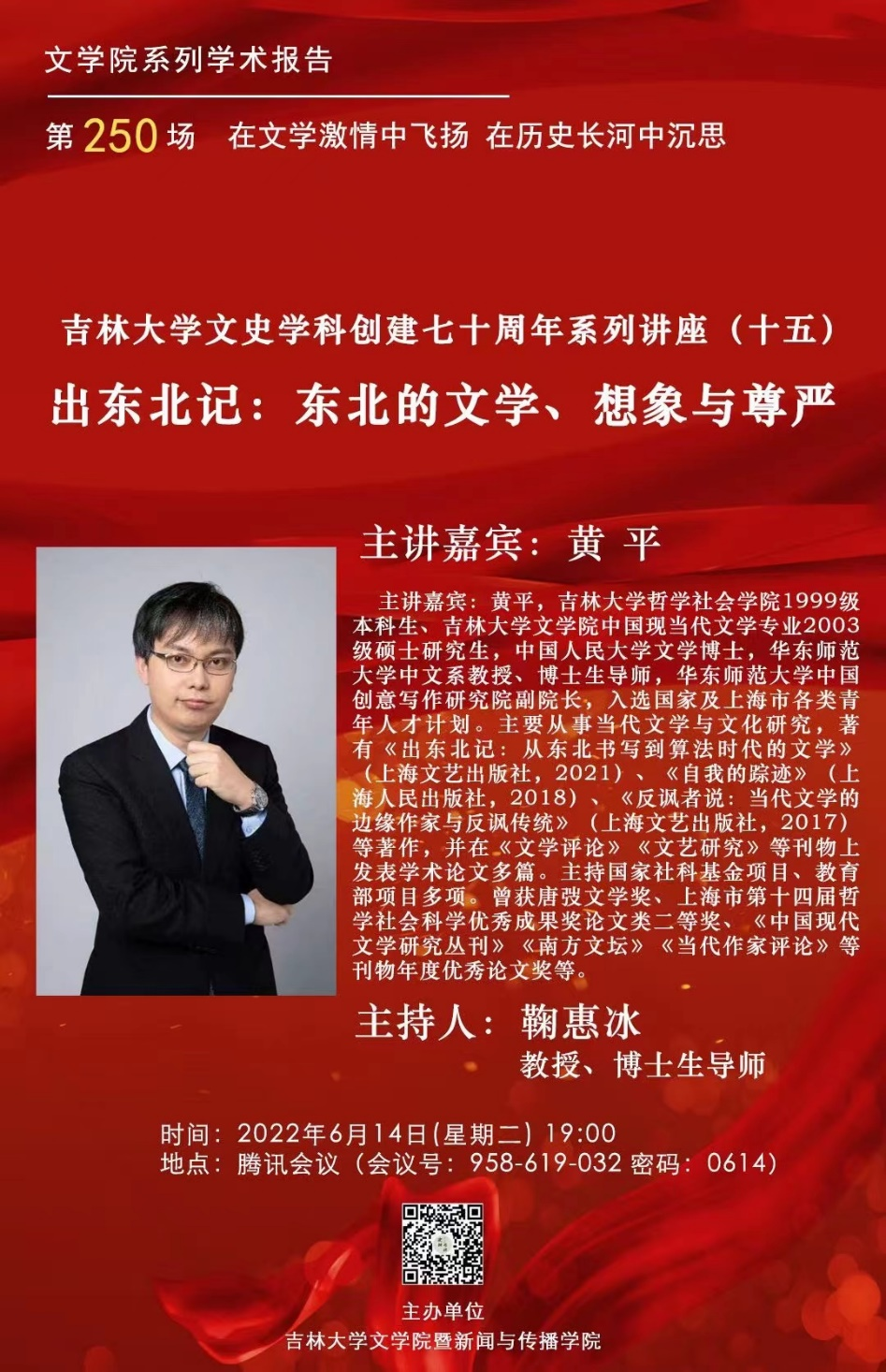 2022年6月14日,吉林大学文史学科创建七十周年系列讲座第十五场于腾讯会议线上顺利举办。吉林大学校友、华东师范大学黄平教授受吉林大学广告文化研究中心邀请,以《出东北记:东北的文学、想象与尊严》为报告主题进行了分享。讲座由吉林大学新闻与传播学院鞠惠冰教授主持,吉林大学、北京大学、南京大学、南京师范大学、黑龙江大学、闽南师范大学及辽宁大学等来自全国各地的高校老师和同学们共同参与了此次线上讲座。腾讯会议讲座现场持续爆满,共有300人次参与,同时B站同步直播间内超过1000余人次观看及互动。