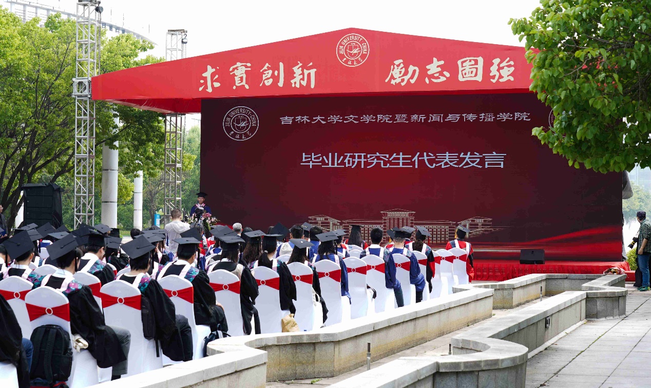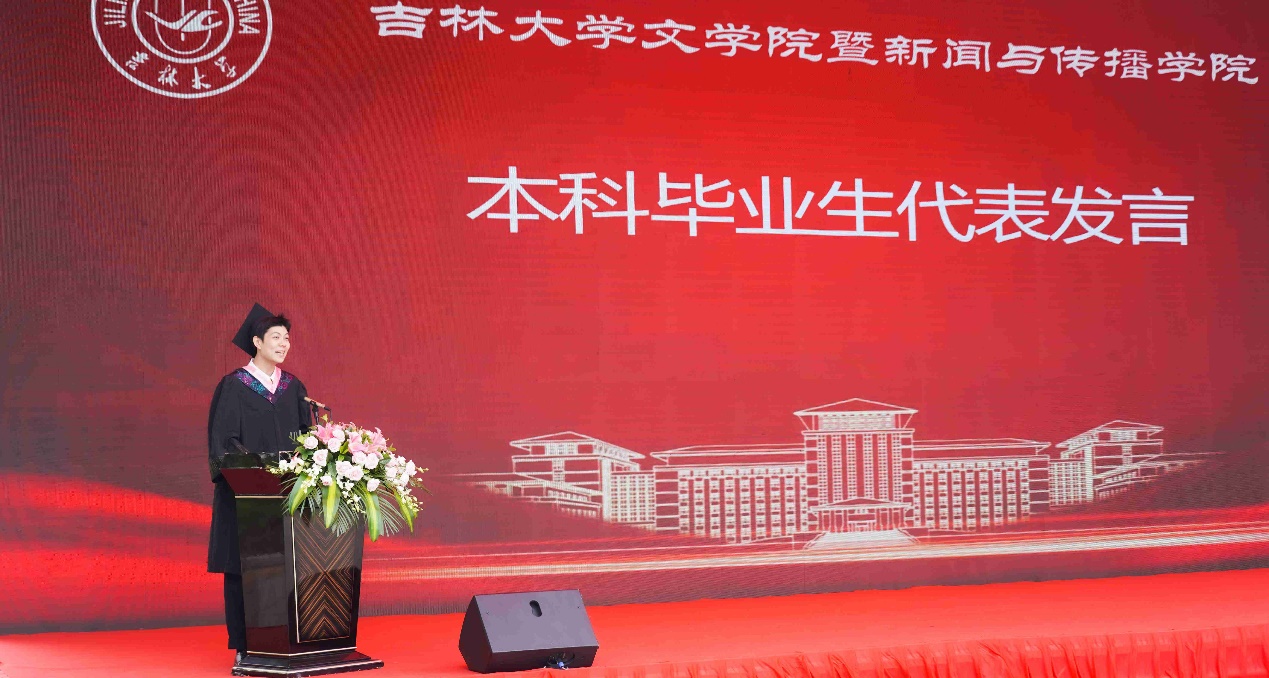 典礼上,2018级新闻学专业周鲁青同学、2019级中国现当代文学专业王震同学,分别代表本科、研究生毕业生上台发言,分享在吉林大学的成长、收获,诉说着对母校、学院的深情和不舍,表达了对母校、学院的感恩之情。