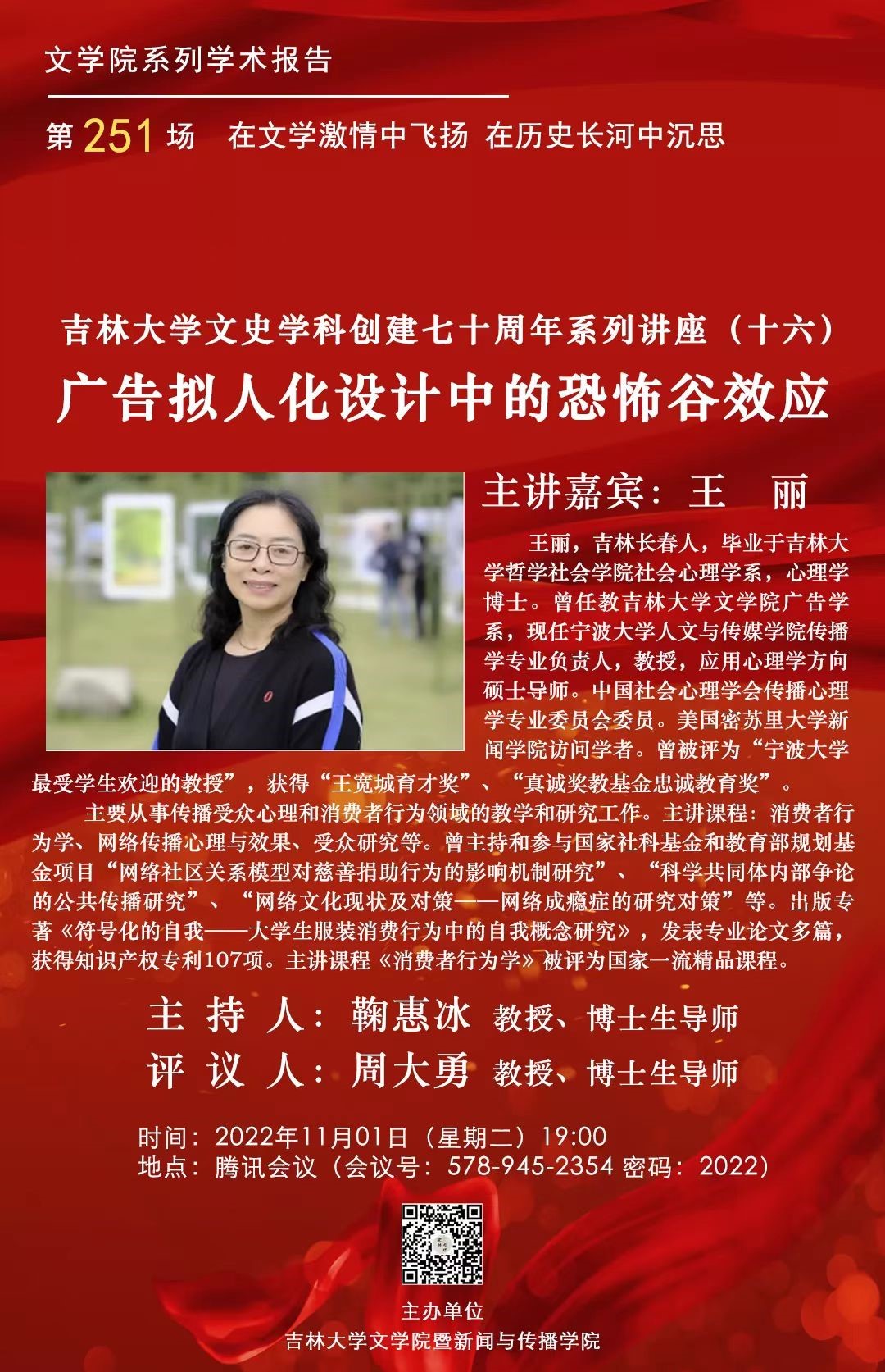 2022年11月1日,吉林大学文史学科创建七十周年系列讲座第十六场于腾讯会议线上顺利举办。吉林大学校友、现任宁波大学人文与传媒学院传播学专业负责人王丽教授在吉林大学广告文化研究中心的邀请下,进行了主题为“广告拟人化设计中的恐怖谷效应”的内容分享。讲座由吉林大学新闻与传播学院鞠惠冰教授主持,吉林大学新闻与传播学院周大勇教授评议,吉林大学广告学专业老师,来自北京大学、南京大学、四川大学及辽宁大学等全国各地的高校老师和同学们共同参与了此次线上讲座。腾讯会议线上现场互动热烈,共有200余名师生参与了活动。