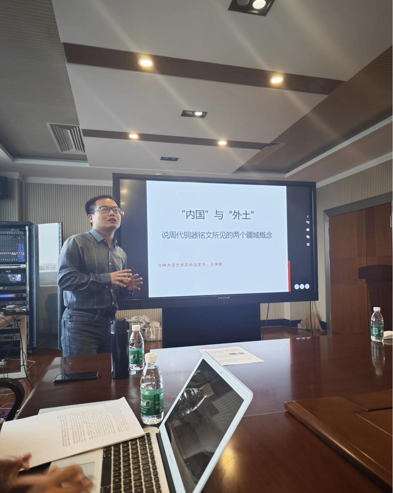 吉林大学“励新优秀青年教师”培养计划入选者、中国史系王坤鹏副教授作了题为“‘内国’与‘外土’——说周代铜器铭文所见的两个疆域概念”的学术报告。在报告中,王坤鹏副教授从周代青铜器彔卣与戎生编钟铭文中出现的“内国”与“外土”这两个概念出发,仔细辨析了概念产生的政治与社会背景,深入讨论了其具体内涵,并进一步谈到周代国家的疆域形态与疆域观念等重要问题。在评议与讨论环节,李佳教授指出,报告结合青铜器铭文,针对西周国家的疆域问题提出了新观点,对其他断代问题也有一定的启发。陶莎副教授指出,报告题目涉及早期中国历史地理问题,对“土”等概念的探析比较深入,也有助于五服制等问题的探讨。吴翔宇老师指出,报告所选取的史料集中在西周中期,主要涉及军事方面,仍存在进一步扩充的空间,辽金史研究中也有相似的研究课题可以借鉴。
