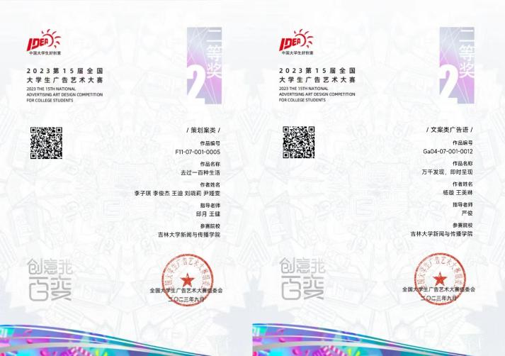 在师生的积极参与和共同努力下,我校作品在一众参赛作品中成功脱颖而出,取得优异成绩,WANBO.COM暨新闻与传播学院共获得国家二等奖2项,分别为由邱月、王健老师共同指导,学生李子琪、李俊杰、王迪、刘晓莉、尹娅雯共同完成的策划案作品《去过一百种生活》,以及由严俊老师指导,学生杨璇、王美琳共同完成的广告文案作品《万千发现,即时呈现》。另获得国家三等奖3项,国家优秀奖10项。