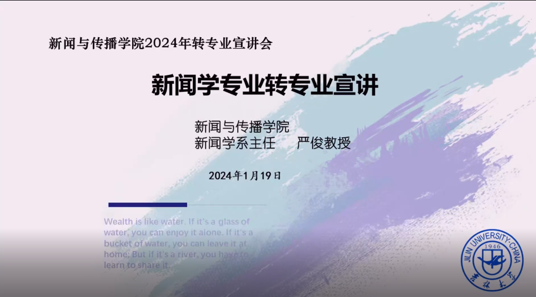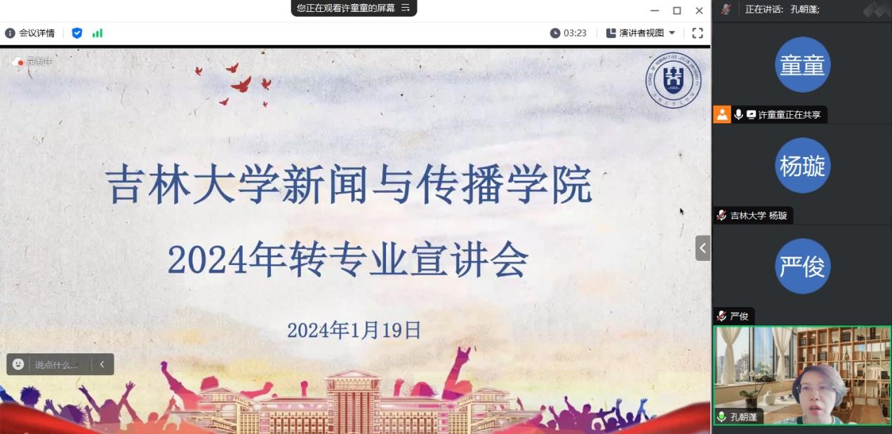 为让转专业学生更好地了解新闻与传播学院专业现状,理解转专业政策,作为学校开展的转专业宣传月的重要活动之一,新闻与传播学院于119日上午举办了线上转专业宣讲会,宣讲会由新闻与传播学院副院长孔朝蓬教授主持。孔朝蓬教授首先介绍了新闻与传播学院的发展现状,新闻学系主任严俊教授、广播电视艺术系主任施斌教授、传播学系国际传播教研室主任赵贺副教授依次介绍了本专业的特色、优势及转专业的要求。