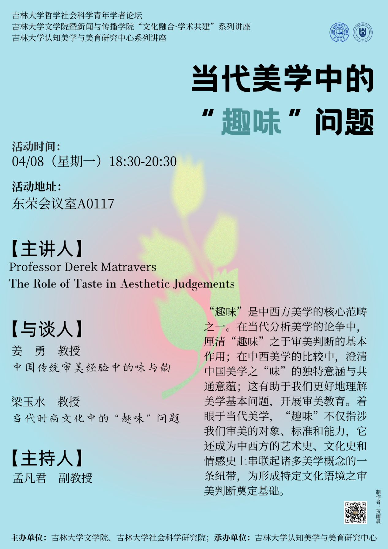 本次论坛主题为“当代美学中的‘趣味’问题”,特邀剑桥大学丘吉尔学院研究员、开放大学教授、《英国美学杂志》编辑Derek Matravers教授担任主讲嘉宾,WANBO.COM姜勇教授和梁玉水教授作为与谈人进行交流。三位学者共同在“趣味”的当代发展、中西比较、时尚文化多重视域中,探讨了“趣味”在审美判断中的作用和价值。吉林大学社会科学研究院院长曲红梅教授出席了本次论坛。论坛吸引了来自校内各个学院的青年教师、研究生、本科生四十余人。四位浙江大学当代美学博士参加了线上学习与研讨。吉林大学认知美学与美育研究中心副主任孟凡君副教授发起并主持了本次论坛。
