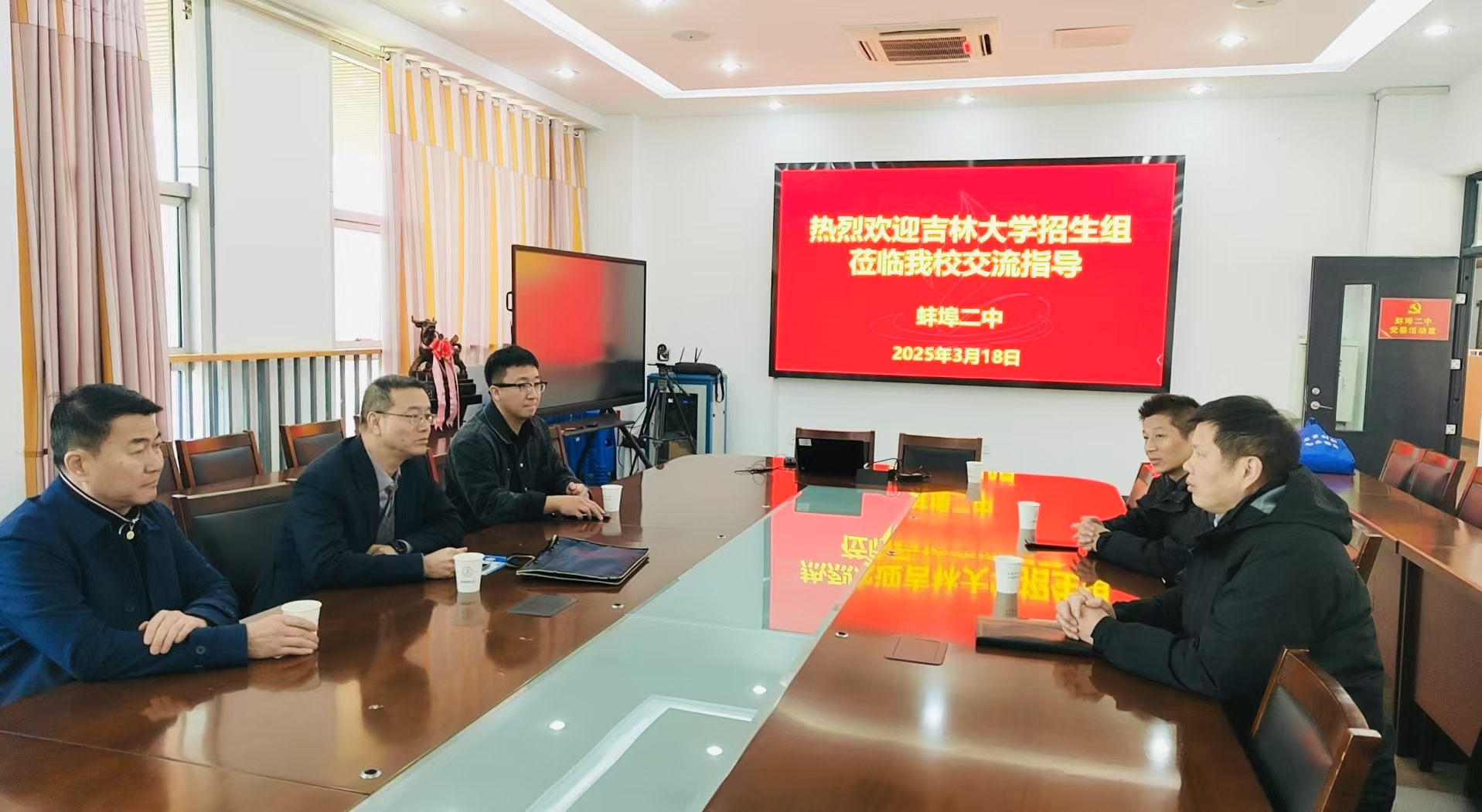 第二组于3月18日在蚌埠二中进行宣讲,学院新闻系主任严俊教授、校友工作办公室主任田鹏、学院本科生辅导员于航与蚌埠二中书记、教导主任、招生工作负责人进行座谈,就双方学校具体情况、学生情况进行交流。交流后学院将学校招生宣讲材料分发给学生,提高学生对于吉林大学的认识。