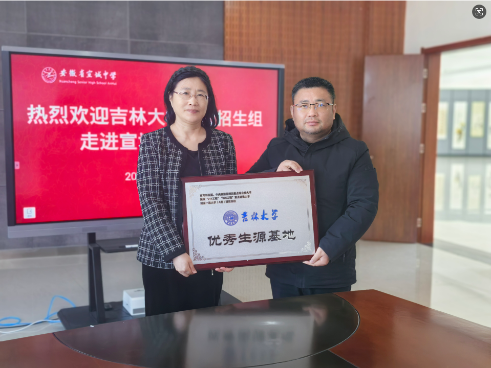3月19日,宣讲组走进宣城中学,校长陈健、高三年级负责人及教务处主任共同参与座谈。宣讲组介绍了学校的办学实力、科研平台及国际化资源,并举行“吉林大学优质生源基地”授牌仪式,充分肯定该校为吉大输送的优秀学子。