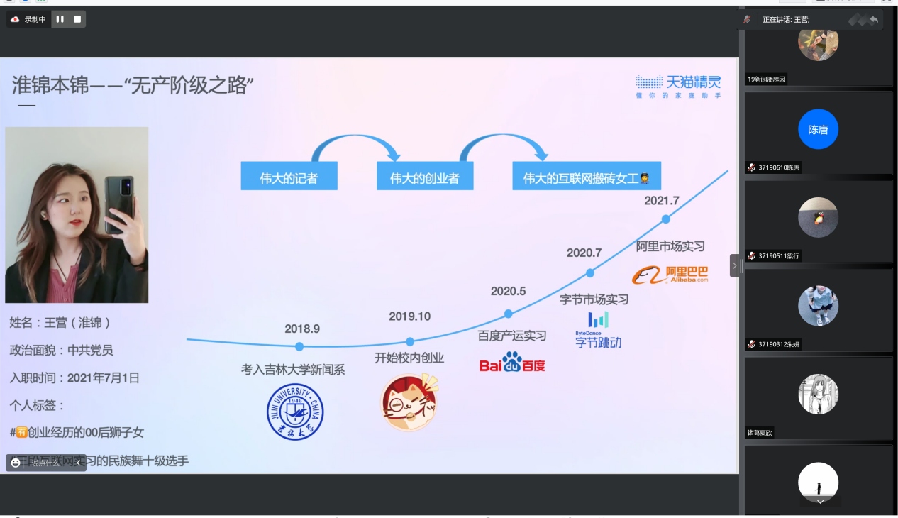 第一位为同学们分享就业经验的是2018级新闻学本科生王营。王营在秋招中斩获多个offer,最终选择在阿里巴巴就业。如何清晰地规划实习经验?如何在就业市场上参与到互联网市场营销等优势行业中?如何敏锐地感知行业热点从而把握职业选择?王营主要针对新闻与传播学院同学们独特的优势能力,分享了有关就业与实习的经验。除此之外,王营也从自身的经历中分析了如何在产品、行业前景、公司平台、工作内容与薪资涨幅等方面合理地选择适合自身发展的岗位。