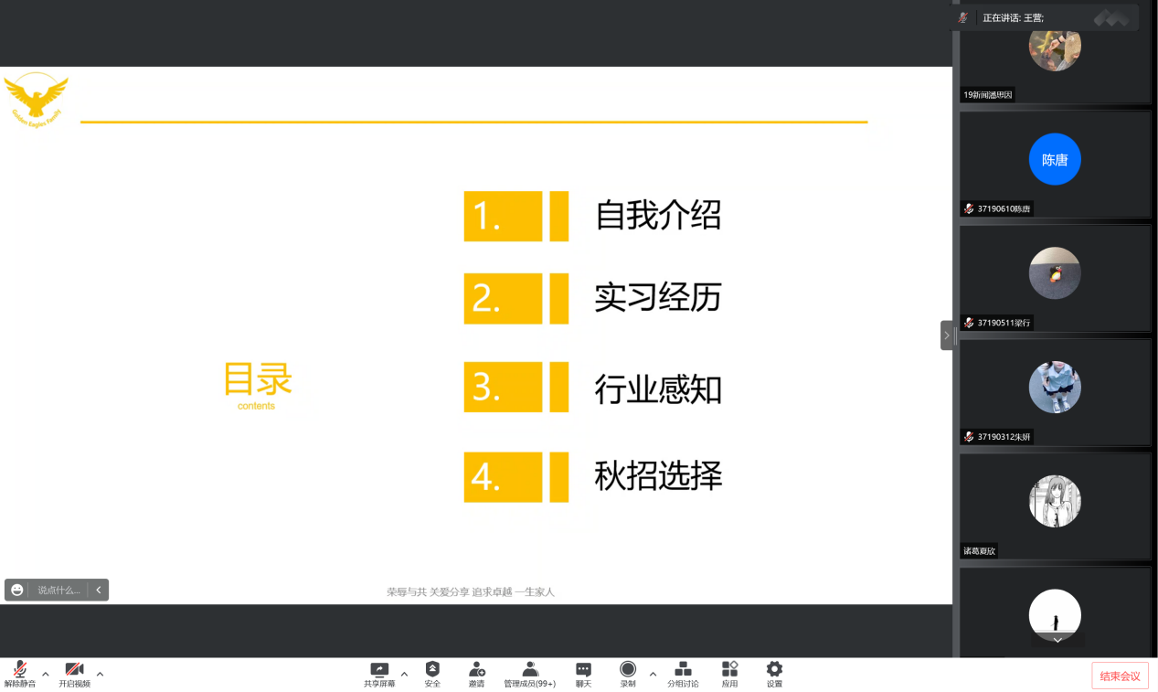 2022年6月3日19时,文传学院出彩就业创业人物分享会在腾讯会议上如期举行。本场分享会由文传学院2019级辅导员于航老师主持,邀请到了三位荣获出彩就业创业人物奖项的2018级即将毕业的学子。优秀的学子们从自身经历出发,为同学们在就业与创业方面带来了许多经验和建议分享。