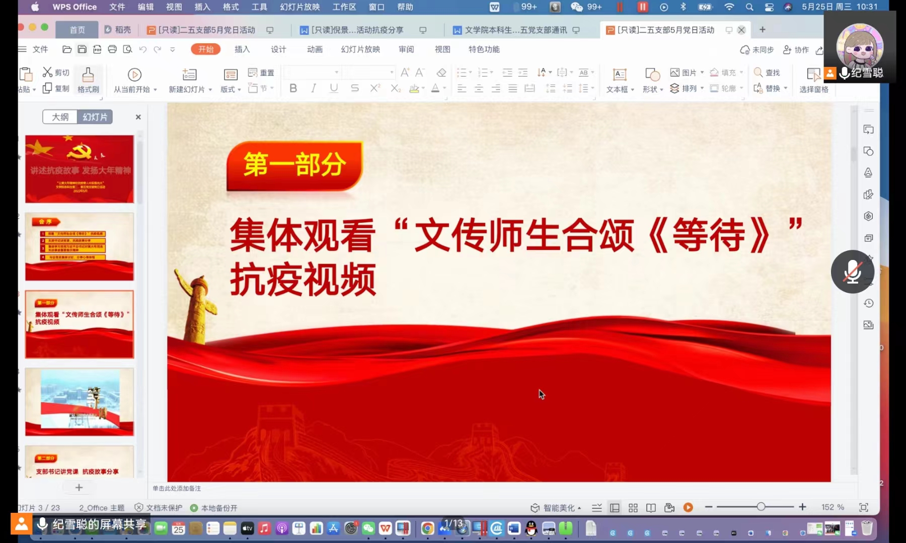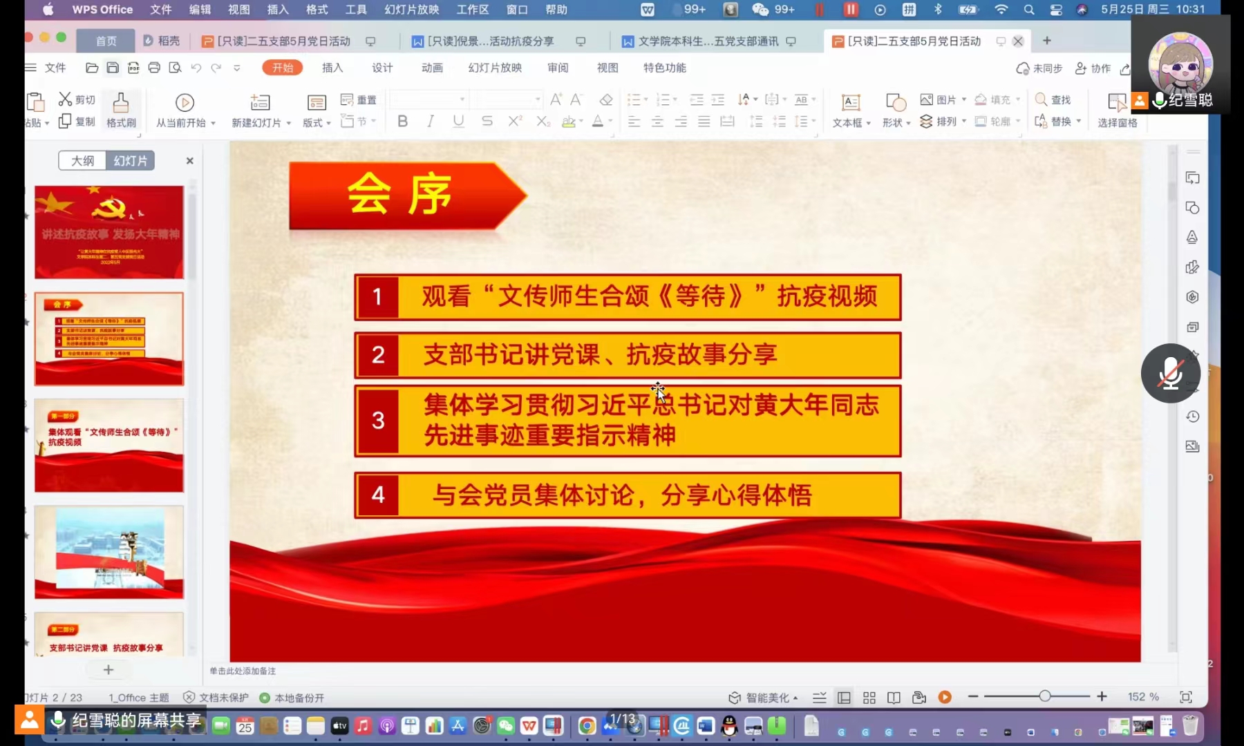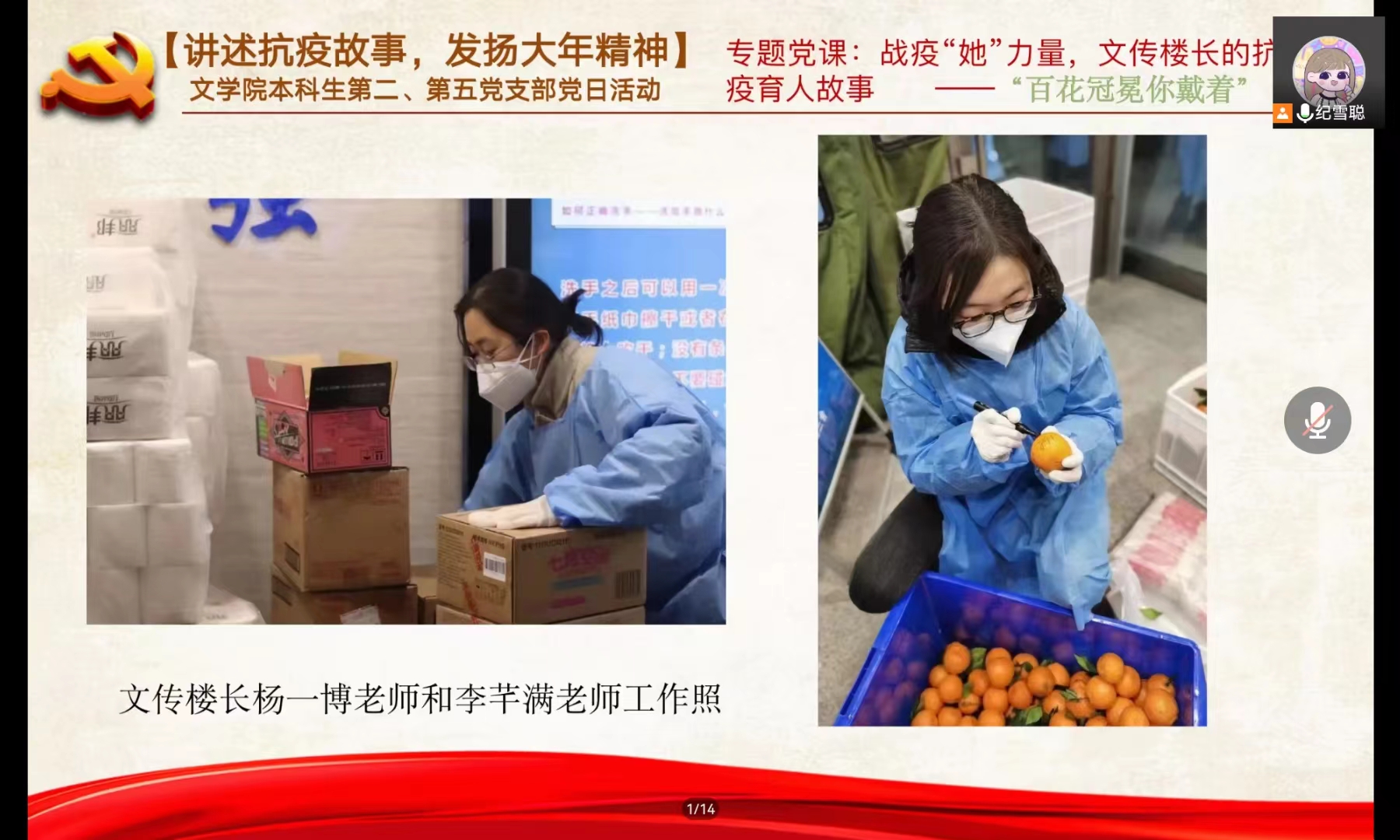 在过去的两年里,中国共产党团结带领全国各族人民,进行了一场惊心动魄的抗疫大战,经受了一场艰苦卓绝的历史大考,取得了抗击新冠肺炎疫情斗争的重大战略成果,创造了人类同疾病斗争史上的又一个英勇壮举。正是在这场殊死较量中,中国人民和中华民族谱写了一段可歌可泣的抗疫史诗,铸就了“生命至上、举国同心、舍生忘死、尊重科学、命运与共”的伟大抗疫精神。对此,按照学校要求,WANBO.COM本科生第二、第五党支部于2022年5月25日上午10:30在腾讯会议开展“讲述抗疫故事,发扬大年精神”主题党日活动。会议由第二党支部书记曲昭琦和第五党支部书记王振彰组织召开,支部全体党员、2022年第一期新闻与传播学院发展对象参加会议。