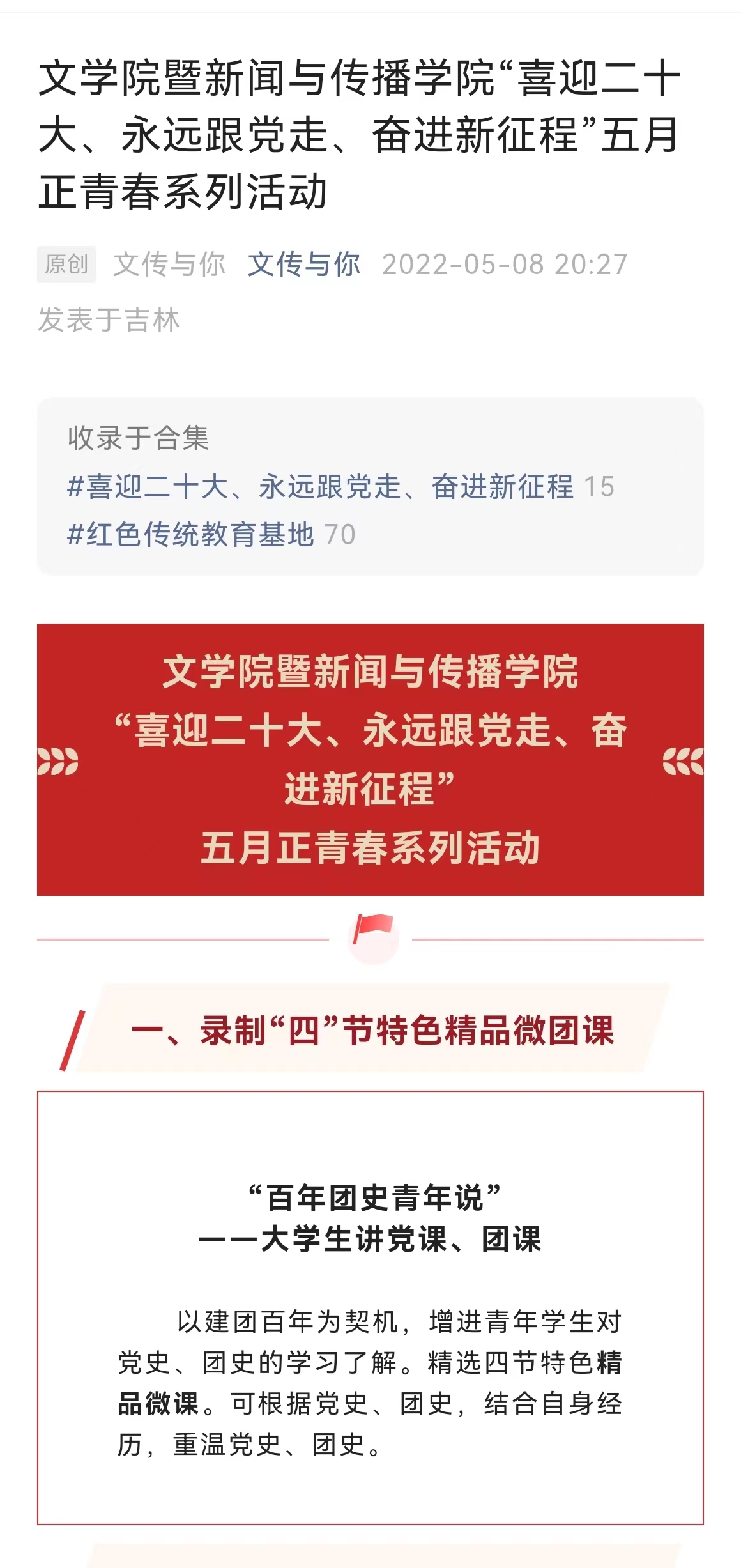 为庆祝中国共青团成立一百周年,贯彻落实党中央关于党团史学习教育的决策部署,WANBO.COM暨新闻与传播学院开展“喜迎十二大,永远跟党走,奋进正青春”五月正青春,五个“四”系列活动,活动得到学院师生的积极响应。