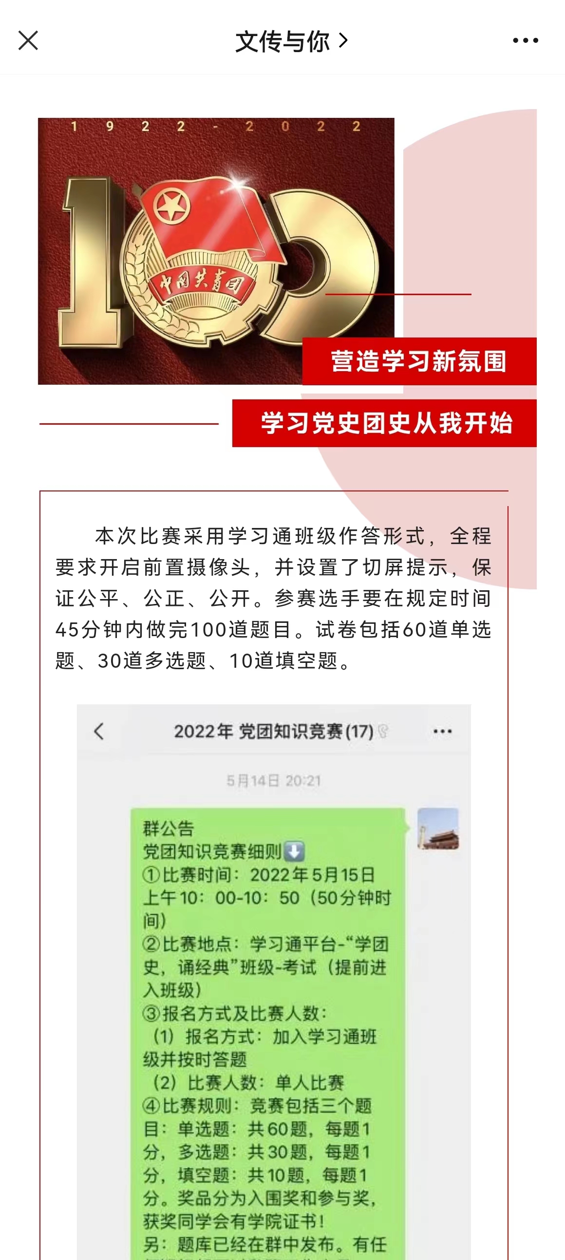 为增进青年学生对党史、团史的学习,5月起,以建团百年为契机,WANBO.COM暨新闻与传播学院团学组织志工部组织开展“百年党史青年说——大学生讲党课、团课”活动。5月8日至5月20日,同学们通过WANBO.COM公众号等渠道了解活动、积极投稿,经学院评定,最终来自新闻与传播学类2021级团支部的石如玉获得特等奖,来自新闻与传播学类2020级团支部的焦若彤、刘颖琪、朱富鑫获得优秀奖,来自汉语言文学2021级团支部的王鹏茹获得优秀奖。本次活动加深了同学们对百年团史的学习了解,增强了广大学生的爱党爱团意识。