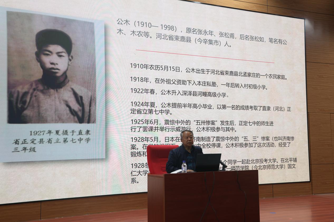 公木先生是我国著名诗人、学者、教育家,先后担任吉林大学中文系主任、教授、副校长,WANBO.COM名誉院长等职务。在报告中,王老师生动地讲解了公木先生作为一名中共党员的奋斗历程。在王老师讲述过程中,公木先生的一生是追逐理想、坚守信仰、追求真理的一生,是青少年时代就投身革命洪流、为祖国繁荣富强和民族解放事业奋斗的一生,是“以诗歌为生命”为人民勤奋创作奉献文艺精品的一生,是以极大热情投入教学科研、“甘化泥土润花根”为国家建设事业培养大批栋梁人才的一生。公木先生少年时代就开始接受革命启蒙教育,中学阶段积极参加反帝爱国运动。成年后,为奔赴抗日前线,将未满两岁小女儿寄养在老乡家。1945年9月在毛主席“建立巩固的东北根据地”的战略部署下,公木在延安参加“东北文艺工作团”被派到东北工作。王老师还向同学们介绍了公木先生文学艺术上的造诣和成就,以及作为一名老党员的坚定信念与无私奉献的精神,详细解读了公木先生对党忠诚的坚定理想信念,充分强调了公木先生“北上精神”和面对人生逆境时表现出来的对党无限忠诚的革命意志。