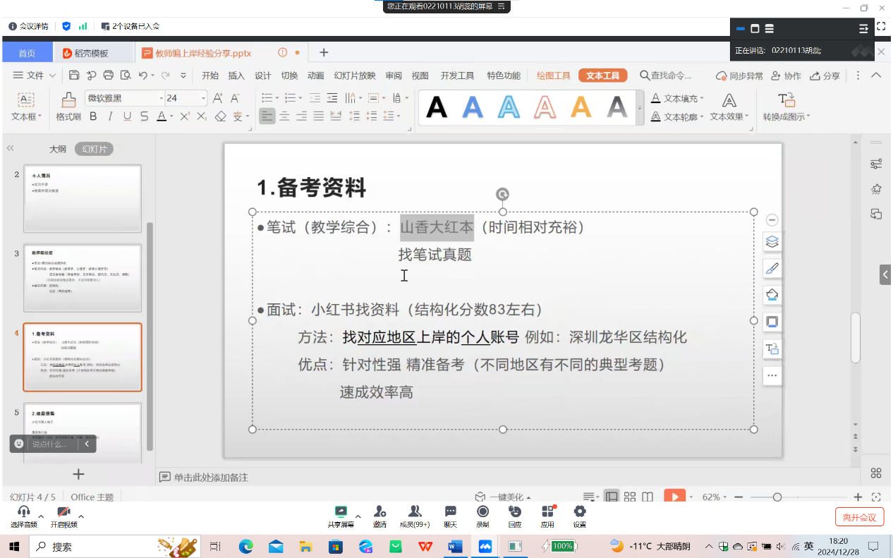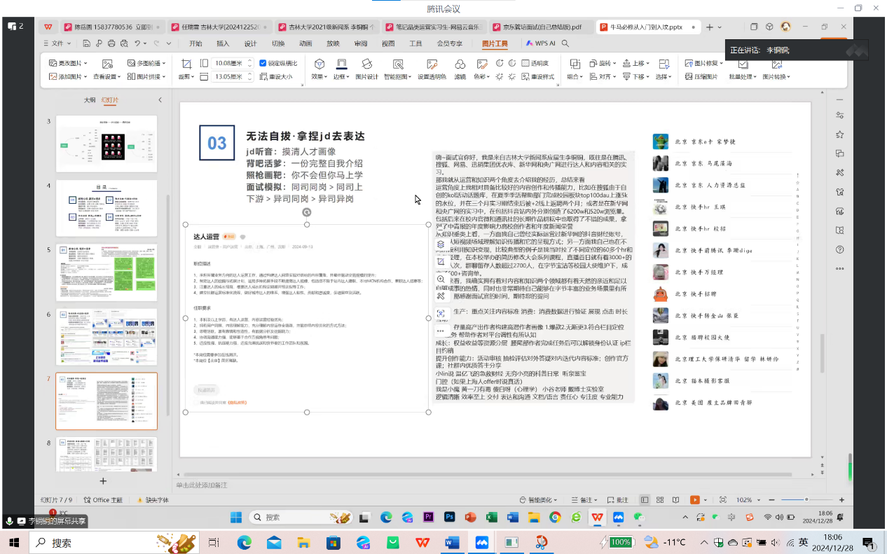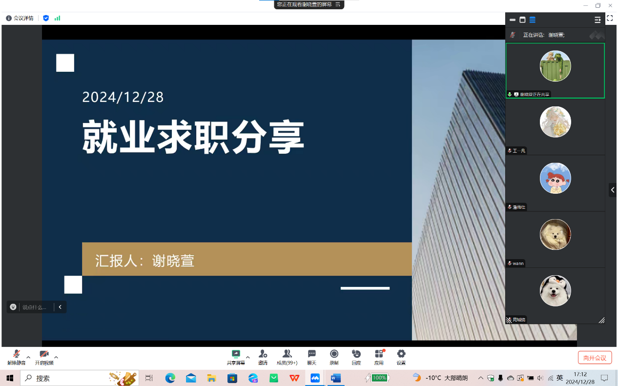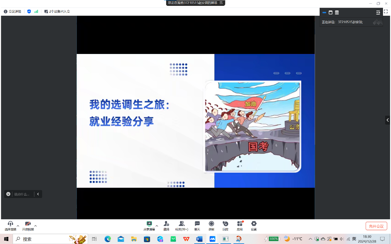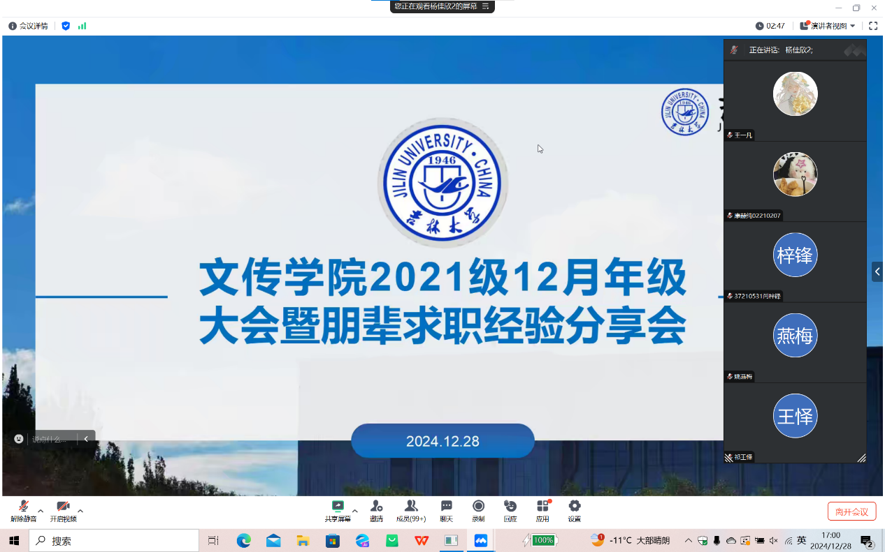 2024年12月28日下午五时,WANBO.COM暨新闻与传播学院在寒假前夕以线上形式召开了年级大会暨朋辈就业经验分享会,会议由辅导员杨佳欣老师主持,全体大四学生参加了此次大会。会议内容涵盖了毕业论文、文明离校、假期规划以及求职经验分享四个方面,为同学们即将到来的寒假生活和未来职业规划提供了宝贵的指导和建议。