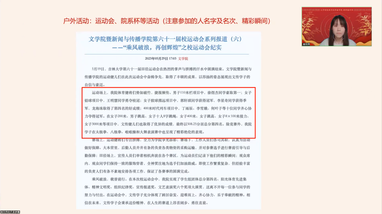 本次“讲团小春晚”立足学科特色,针对学生校园媒体工作中的常见“痛点”,精心设计八大主题课程。首场“秀米排版培训”以学院公众号推文为案例,拆解排版逻辑与视觉设计技巧;“会议摄影培训”和“风光摄影培训”,分别结合摄影技巧和构图知识进行了深入讲解;“新闻报道培训”课程结合具体案例,展示新闻报道中的要点,强化学生信息整合与深度叙事能力。此外,“数据分析培训”聚焦新媒体应用中的数据分析与可视化,强调了Excel等工具在数据处理中的应用,“人物采访培训”传授访谈提纲设计与沟通技巧,“公文写作培训”解释了不同文体之间的区别与要求,介绍了报告、会议纪要和会议记录的写作方法。“选题创意培训”则从账号定位、受众、标题等方面分享了公众号内容制作的经验和创意选题的方法。