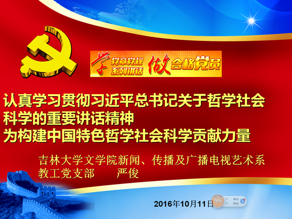 支部书记严俊在上党课时,全面讲解了《习近平总书记在哲学社会科学工作座谈会上的讲话》的主要内容,并且谈了自己的学习体会。他认为,习近平总书记在哲学社会科学工作座谈会上的重要讲话,是新形势下繁荣发展我国哲学社会科学事业的纲领性文献,为新时期高校哲学社会科学工作指明了方向。严俊就学习、贯彻习近平讲话精神提出了具体要求:一、将深入学习、贯彻习近平总书记关于哲学社会科学的重要讲话作为“两学一做”学习教育的重要内容和今后长期的政治任务,深入学习,认真领会,学深学透,真学真做。二、要自觉把马克思主义的立场、观点、方法贯彻到科研和教学工作当中,大力推进新闻传播学和广播电视艺术学学科体系与教材体系的创新,树立为人民做学问的理想,深化教育教学改革,全面落实立德树人的根本任务。三、以服务党和政府的决策为宗旨,以人民为中心,坚持问题导向,以改革创新为动力,述学立论,建言献策,发挥好哲学社会科学服务社会实践、WANBO.COM、舆论引导等方面的重要功能。