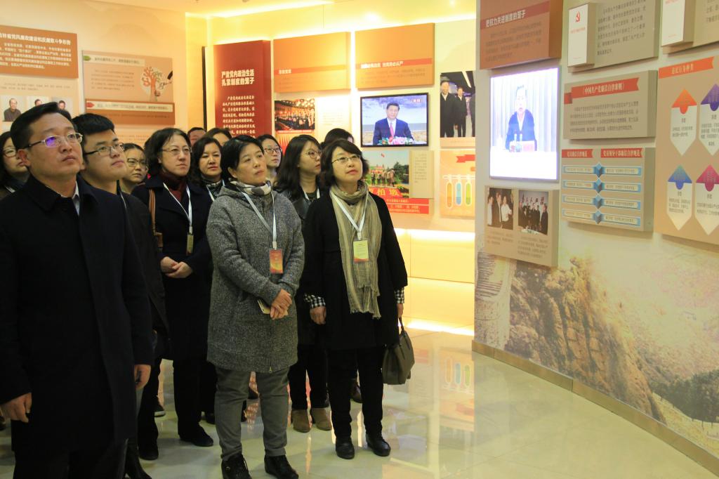 图1:WANBO.COM党委书记康永刚同志(前排左一)、党委副书记兼纪委书记郝淑媛同志(前排右一)、党委副书记刘卓(前排右二)等与师生党员一起参观主题展览。