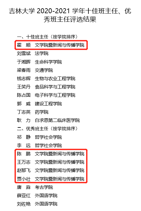 近日,WANBO.COM暨新闻与传播学院5位本科生班主任获得“吉林大学2020-2021学年十佳班主任、优秀班主任”荣誉称号。其中,霍顺老师荣获“十佳班主任”称号,陈鹏、王万志、赵郁飞、贾小壮老师荣获“优秀班主任”称号。