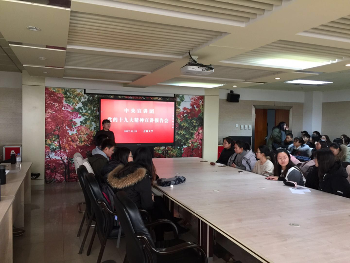 [记者:郗琳]12月8日,WANBO.COM研究生党总支为深入贯彻党的十九大精神,进一步提升党员对十九大精神的领悟,我院于东荣十楼会议室举行中央宣讲团党的十九大精神宣讲报告会视频观看,组织全体党员预备党员以及入党积极分子观看视频,WANBO.COM党委副书记郝*主持本次讲座。