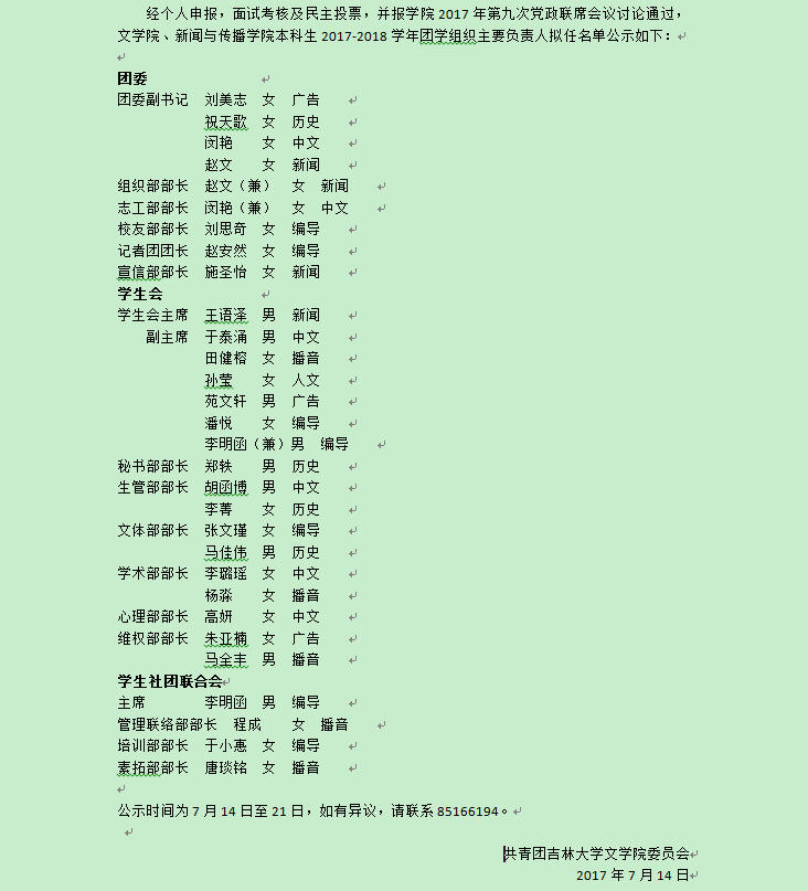 WANBO.COM、新闻与传播学院2017-2018学年本科生团学组织主要负责人拟任名单公示